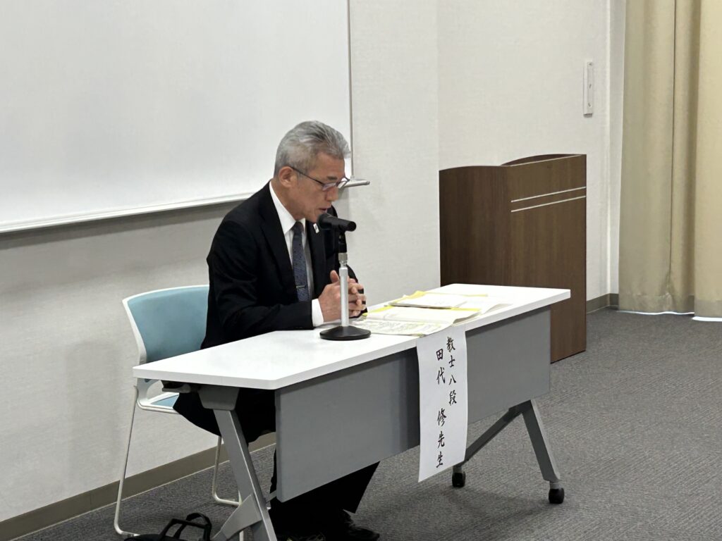 2026年2月3日 / 最終更新日時 : 2026年2月3日 kumakendo お知らせ 令和8年度 剣道段位審査員候補者研修会 熊本県剣道連盟は令和8年度剣道段位審査員候補者研修会を令和8年1月11日に熊本市城南総合スポーツセンター(参加者16名)、25日に益城町総合体育館(31名)で行った。両日ともに田代修教士八段が講師として講話、日本剣道形についての研修指導を担当された。 講話では、審査員としての心構えなどが説明され、実技での切り返しや立ち合い、日本剣道形での着眼点を説明された。三段以上の部では特に気位、気の充実を強調され「観ている人に十分伝わっているか」がポイントと指摘された。さらに、面の「物見」に目が合ってない受審者が散見される、切り返しで竹刀を打っている、立ち合いにおける元立ちとしての引き出し方など、日常の指導における心構えも指摘していただいた。 また「昨年12月の試合で時間的な余裕を持って出発したが、事故渋滞によりギリギリで間に合うという経験をした。試合・審査では突然の代替が利かないだけに、十分過ぎる時間を見込んでほしい」と述べられた(了)。