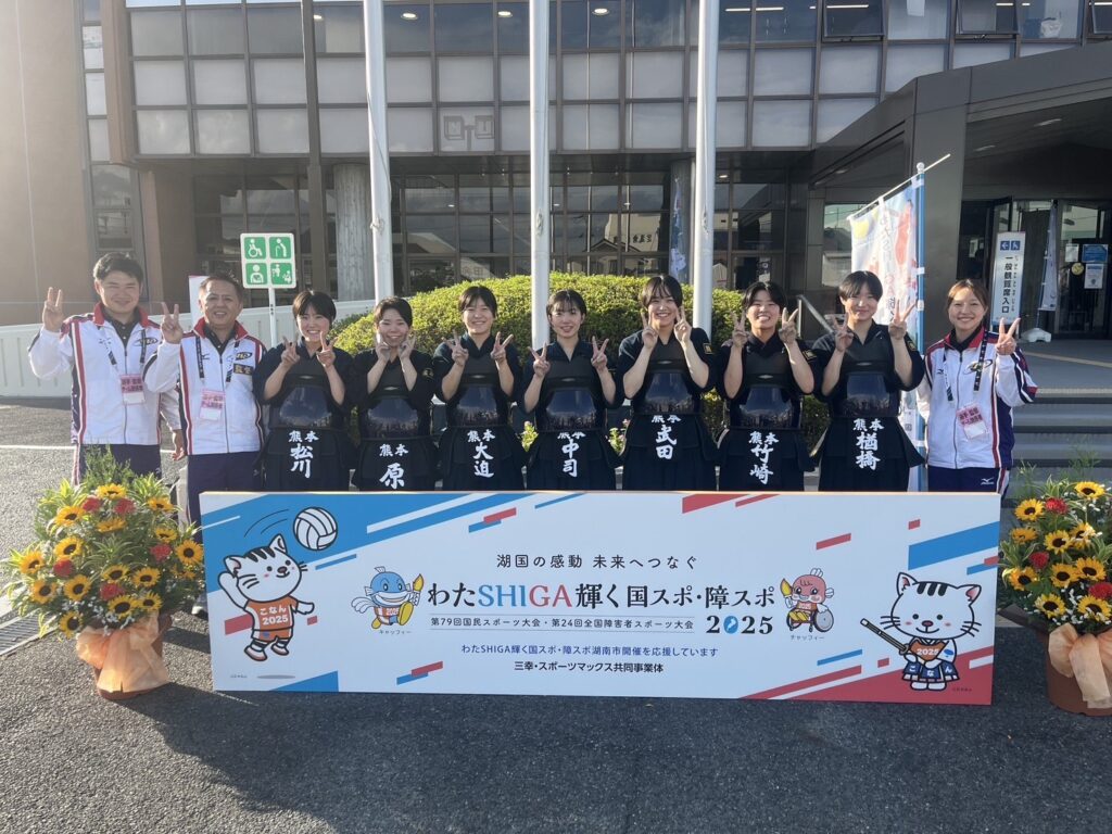 2025年10月15日 / 最終更新日時 : 2025年10月15日 kumakendo 大会結果 第79回国民スポーツ大会剣道競技 ◎少年女子、26年ぶりの快挙 第79回国民スポーツ大会の剣道競技が9月29日~10月1日に滋賀県の湖南市総合体育館で行われ、県勢では少年女子が熊本国体(平成元年)以来26年ぶり7度目の優勝を果たした。 県チームは玉竜旗優勝、高校総体の団体3位、個人優勝の中司美羽を中心とする八代白百合に菊池女子高の原碧海を加えたメンバーで出場、1回戦の神奈川を3-0、2回戦で岡山を3-0、準決勝で東京を2-0で下し勝ち進んだ。決勝の相手は地元の滋賀、先鋒・原が面の1本勝ちした、次鋒から副将までが引き分けた後、大将の武田詞葉が面と小手を決め、チームは1回戦から「敗者なし」の完全優勝を飾った。 成年男子は1回戦で愛媛を3-0、2回戦の長野を4-0で制したが、3回戦で滋賀に4-1で敗れた。