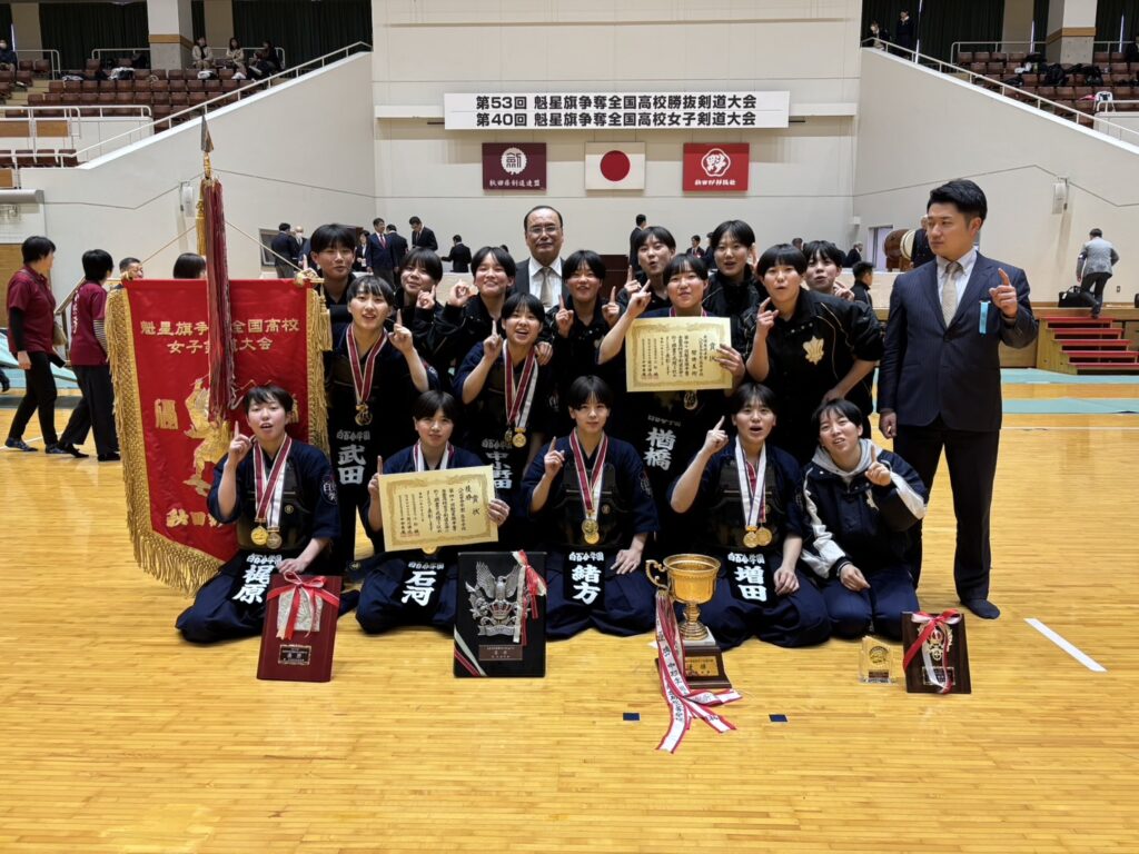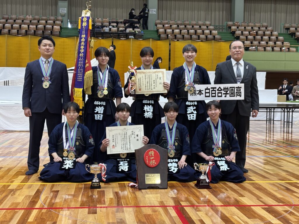 令和8年3月下旬に行われた2つの令和7年度全国高等学校剣道大会で、八代白百合学園が女子団体の頂点に立つ偉業をなしとげた。愛知県加春日井市で開かれた全国高校選抜大会(3月26〜28日、愛知県春日井市総合体育館)と魁星旗争奪全国剣道大会(3月29〜31日、秋田県立武道館)で優勝し、澤田武秀監督は「夏の大会に向けても一丸となって挑戦していきたい」と述べられた。  選抜大会は4年ぶり6度目の優勝。準決では翔凜(千葉)を3-0で下し、明豊(大分)との決勝では2‐2からの代表戦となり大将の楢橋美絢が面を決めた。男子の九州学院は準々決勝で東福岡に惜敗した。 また魁星旗では11年ぶり2度目の優勝。準決勝では4連覇に挑む中村学園女子(福岡)を退け、福岡第一との決勝は1-1からの大将戦で楢橋が胴を奪って競り勝った。菊池女子は5回戦で敗れ、男子団体の九学は準決勝で日章学園(宮崎)に敗退し、3位入賞となった